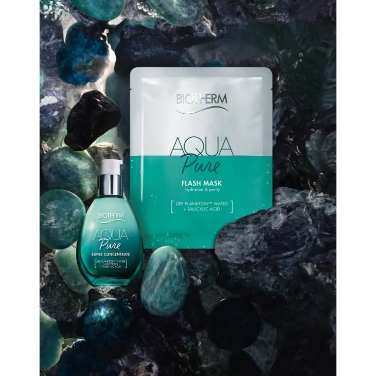 Aqua Pure Flash Mask es una mascarilla hidratante de Biotherm que actúa como una segunda piel que infunde profundamente la piel con una hidratación intensa, impulsada por la combinación de ácido salicílico y agua probiótica Life Plankton, para conseguir una piel pura en una sola aplicación.
