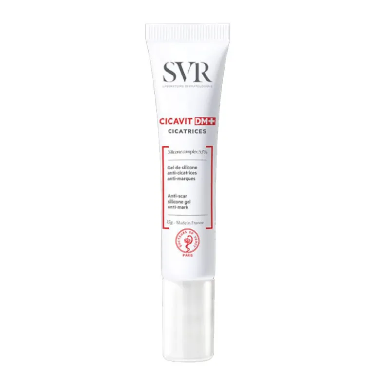 SVR Cicavit DM+ es un gel de silicona tópico indicado para el tratamiento de cicatrices. La fórmula del gel ayuda a mantener la zona húmeda, lo que favorece la cicatrización. El gel también alivia inmediatamente el picor y reduce el enrojecimiento y la tirantez.