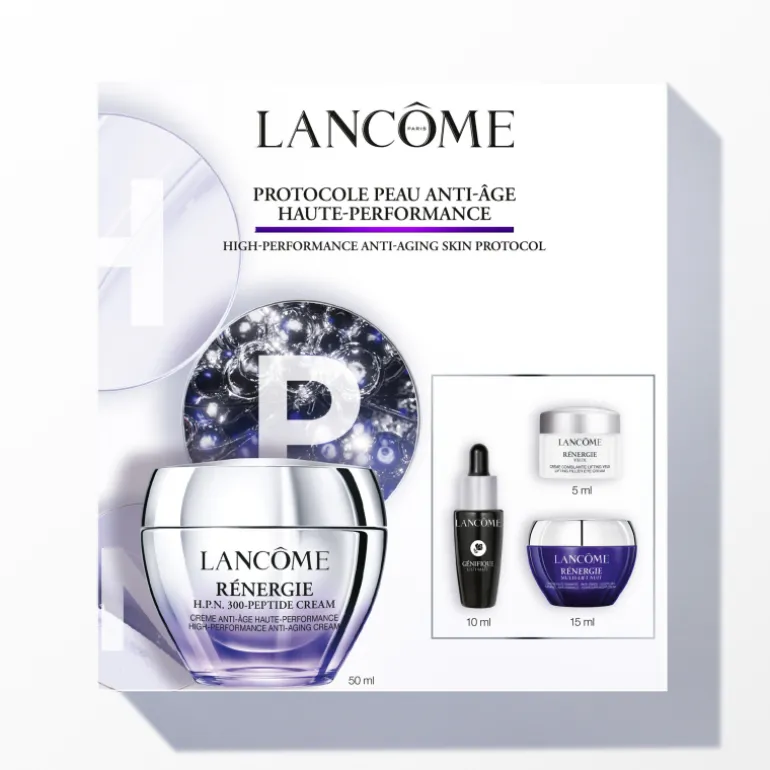 Cofre Rénergie H.P.N. 300-Peptide Cream 50ml de Lancome es un set de cuidado de la piel que contiene una rutina completa de día y noche con sérum facial, contorno de ojos y cremas de día y de noche, para regenerar la piel más rápido de lo que envejece. Este cofre de regalo incluye tus productos de belleza favoritos: – Rénergie H.P.N. 300-Peptide Cream 50ml – Rénergie Crema Contorno de Ojos 5ml – Sérum Génifique Ultimate 10ml – Rénergie Multi-Lift Crema de Noche 15ml
