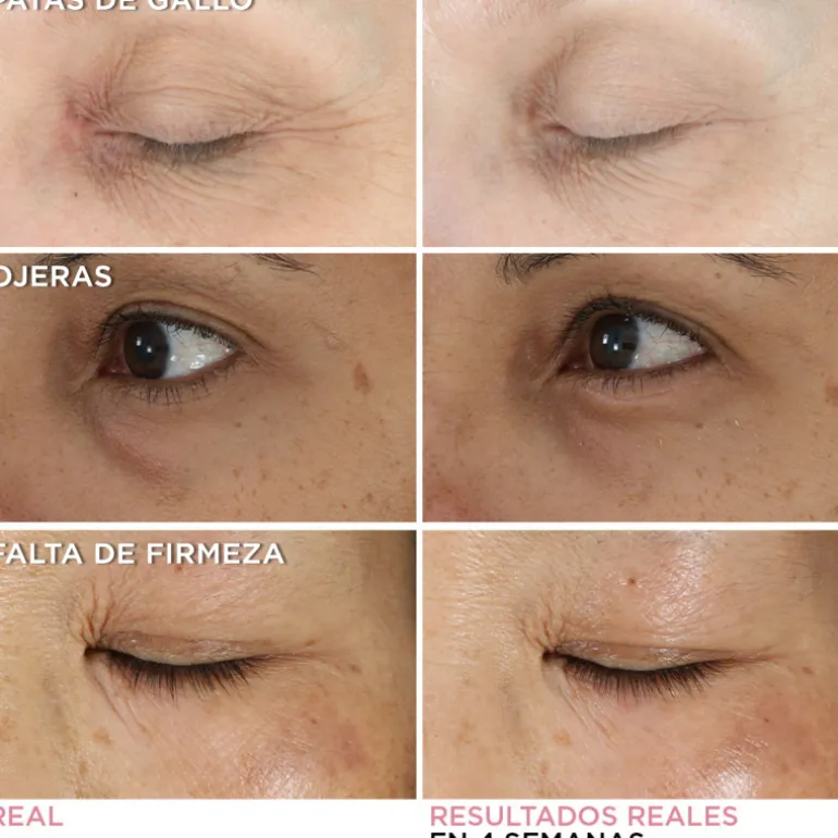 Contorno de ojos clínicamente probado que mejora la hidratación mientras, además, corrige el color e ilumina la zona de la ojera ayudando también a reducir la apariencia de hinchazón, ojeras, líneas de expresión y arrugas