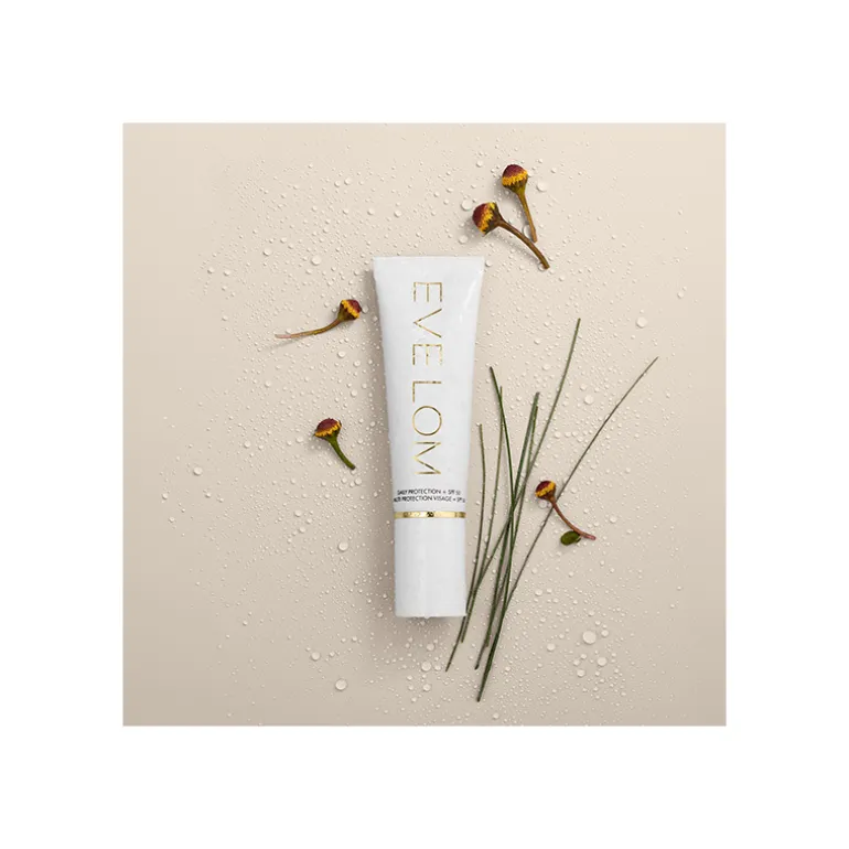 Esta protección diaria de EVE LOM -Daily Protection + SPF 50-, una mezcla específica de filtros solares, vitaminas y extractos naturales, protege contra los rayos UVA y UVB (se le reconoce el PA ++++, calificación máxima de protección frente a los rayos UVA), ilumina, hidrata, reafirma y tensa la piel.