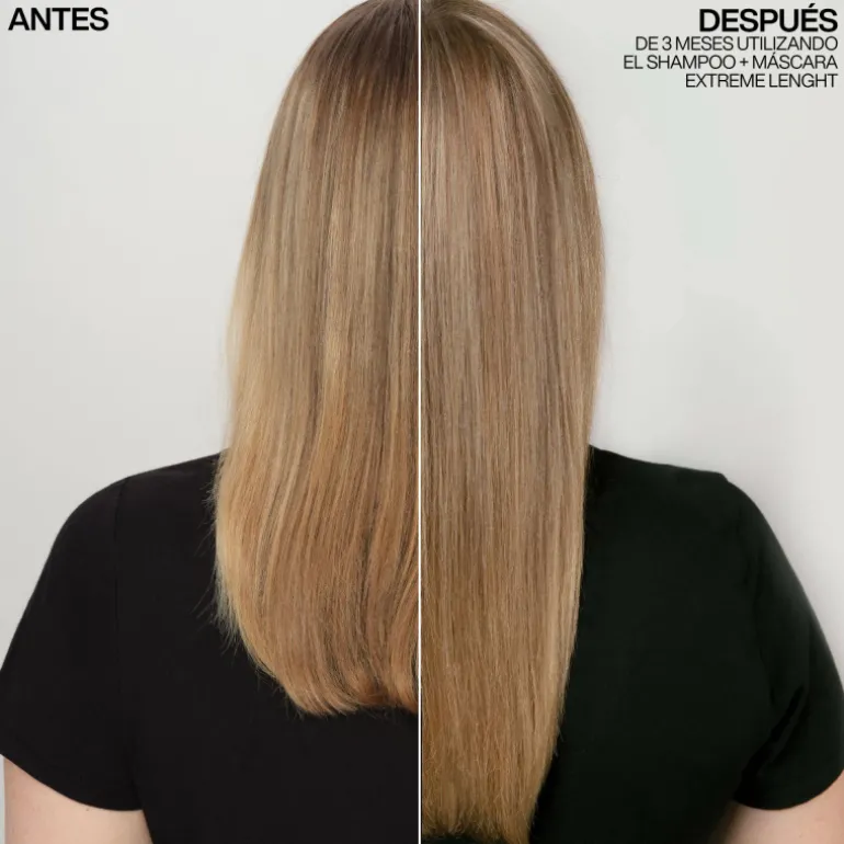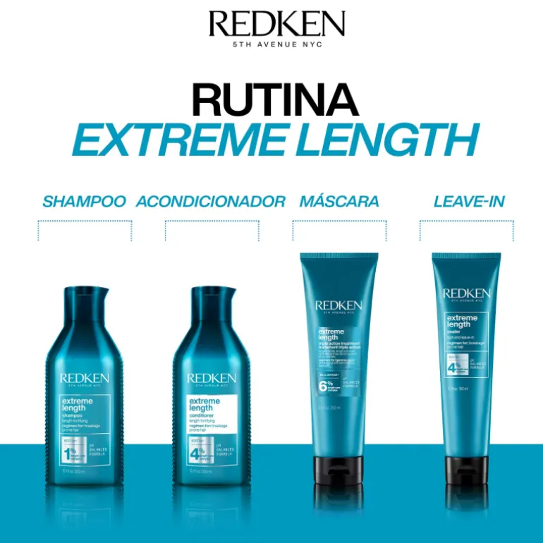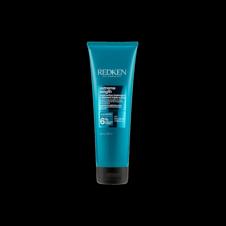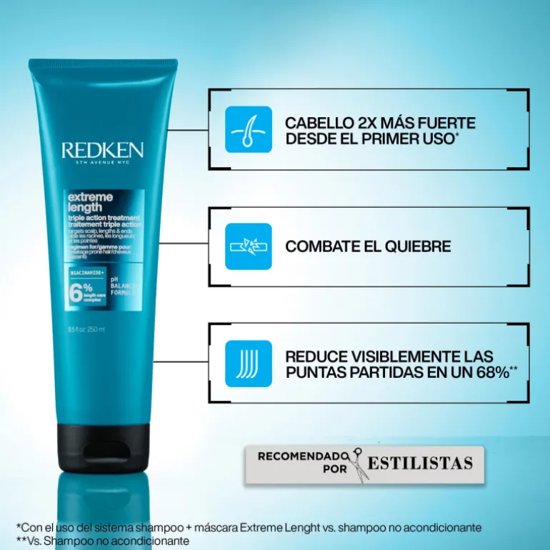 Mascarilla Redken Extreme Length Triple Action para cabello dañado formulado con Biotina, Niacinamida e ingredientes de alta calidad para estimular el crecimiento del cabello y aportar fuerza.