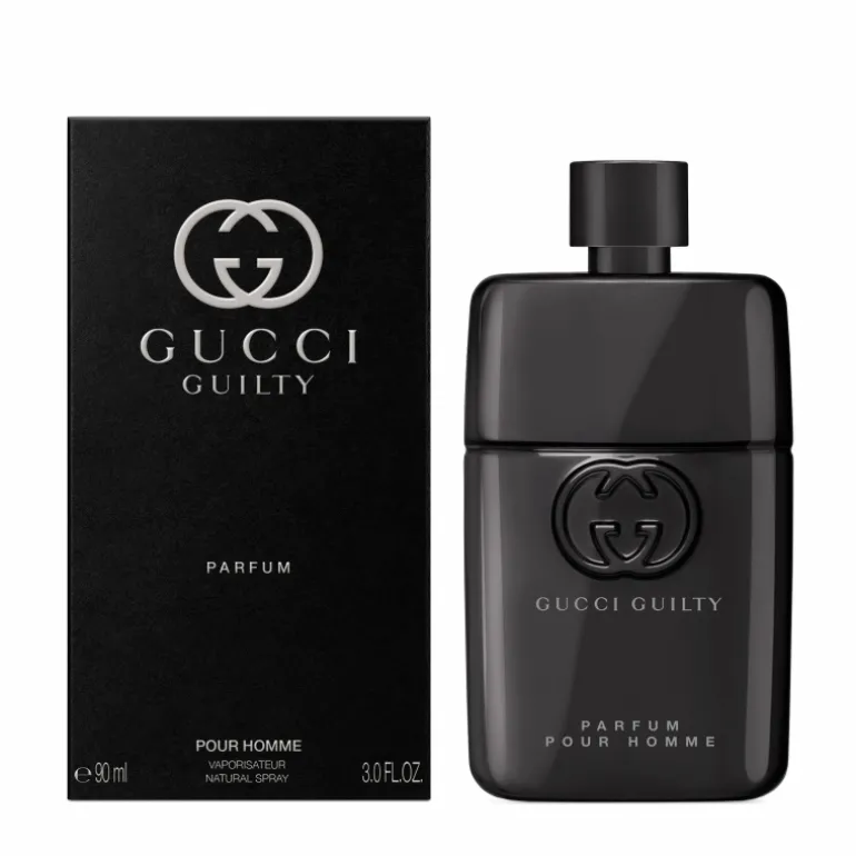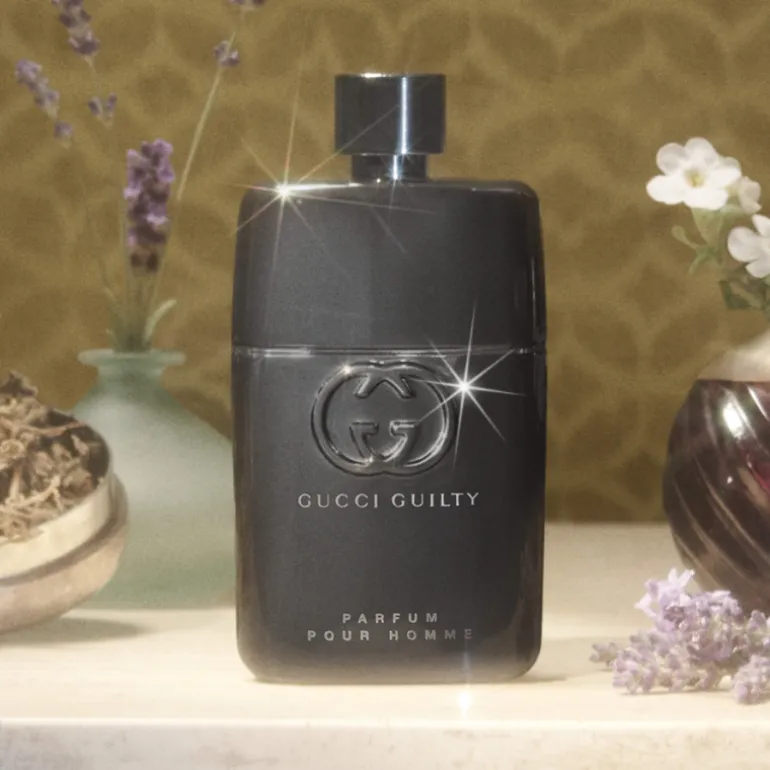 Una fragancia de notas amaderadas y aromáticas, Gucci Guilty Parfum For Him se abre con un ramo de lavandín francés, magnificado en el corazón con la profunda intensidad ambarina que confiere la jara, en combinación con la misteriosa elegancia del pachulí.