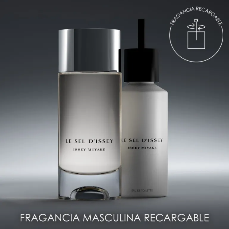Disponible en tamaños de 50 ml y 100 ml, Le Sel d’Issey es recargable con un formato de 150 ml.
