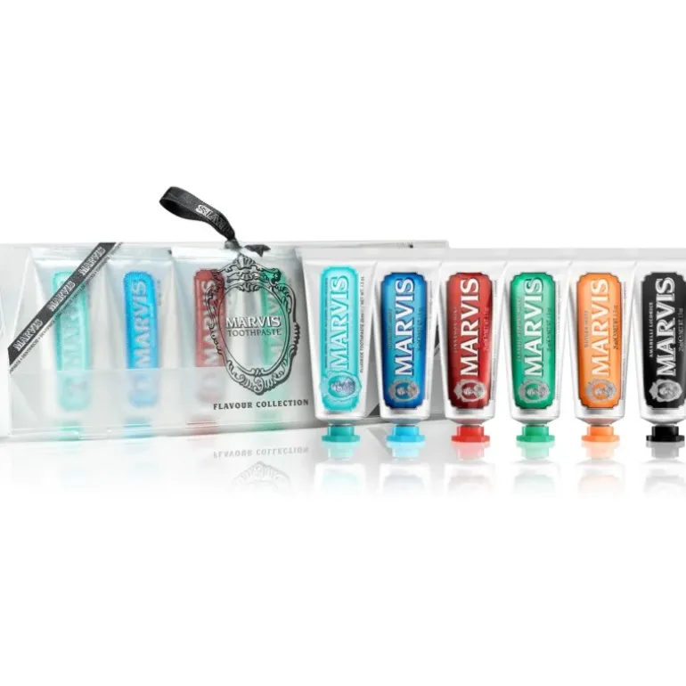 Marvis Estuche 6 Sabores de Pasta de Dientes contiene una crema limpiadora con sabor a menta, otras 3 con sabor a regaliz amarillo, jengibre, jazmín, y 2 más aromatizadas de menta acuática y anís. Son cremosas, suaves, mentoladas y favorecen aliento fresco.