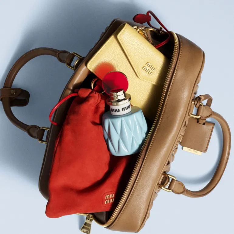 FRASCO ICÓNICO: Envase que evoca la textura matelassé de los bolsos Miu Miu, en azul Azzurro y rojo rubí.