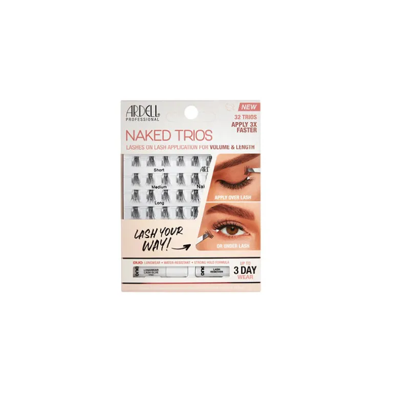 Ardell Naked Lashes Trios Kit. Kit de trios de pestañas individuales que contiene 32 trios, 1 Adhesivo y 1 Remover.