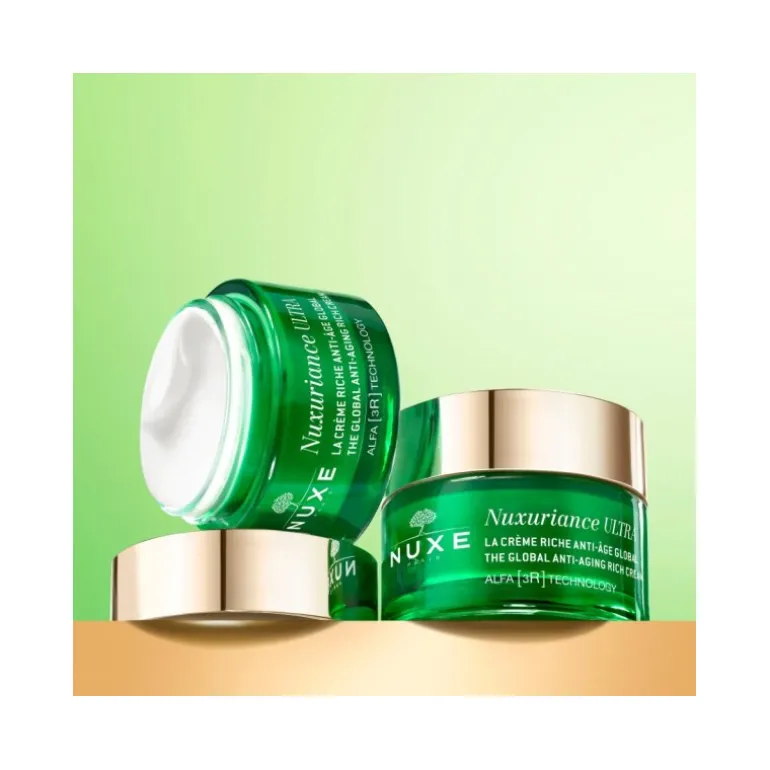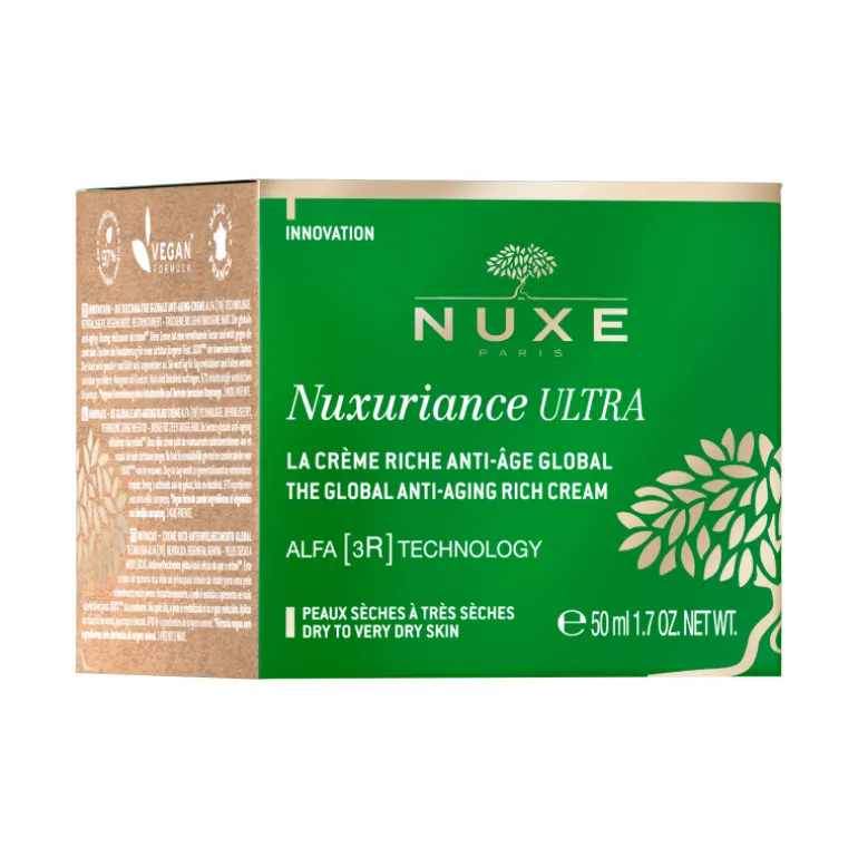 Nuxe Nuxuriance ULTRA Crema Rica Antiedad Global. El antiedad más eficaz que el retinol. Esta crema rica antiedad global corrige de forma visible los principales signos de la edad. La TECNOLOGÍA ALFA [3R]* permite [R]evitalizar, [R]egenerar y [R]enovar la piel. Al instante, la piel está nutrida y más cómoda Eficacia antiedad global combinada con una sensorialidad única gracias a su fragancia femenina, moderna y elegante. Su textura rica y untuosa es ideal para las pieles secas a muy secas. Prueba in vitro *Tecnología Alfa [3R] = extracto de Alfalfa + Ácido Hialurónico + extracto de Hemerocallis Fulva.