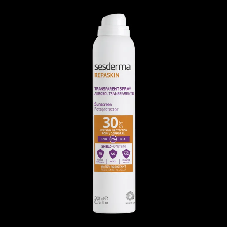 Repaskin Aerosol Transparente SPF30. Lo tiene todo: textura súper ligera y transparente, resistente al agua y lo mejor窶¡en spray! Mucho más cómodo y rápido de aplicar. Además, gracias a su exclusiva tecnología SHIELD SYSTEM no solo protege del sol, sino que ayuda a reparar los efectos negativos que este tiene sobre nuestra piel como las manchas o el envejecimiento prematuro.