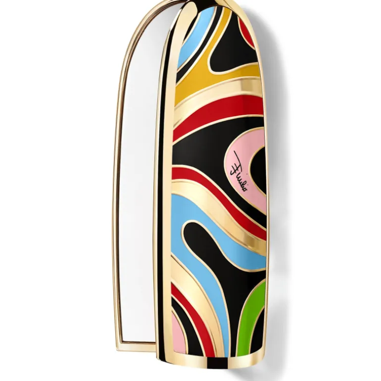 Rouge G Marmo Kiss La carcasa joya con Doble Espejo Edición Limitada. Camille Miceli, directora artística de Pucci, y Violette, Directora Creativa de Maquillaje de Guerlain, fusionan sus talentos para crear una carcasa Rouge G inspirada en el emblemático motivo Marmo de Pucci.