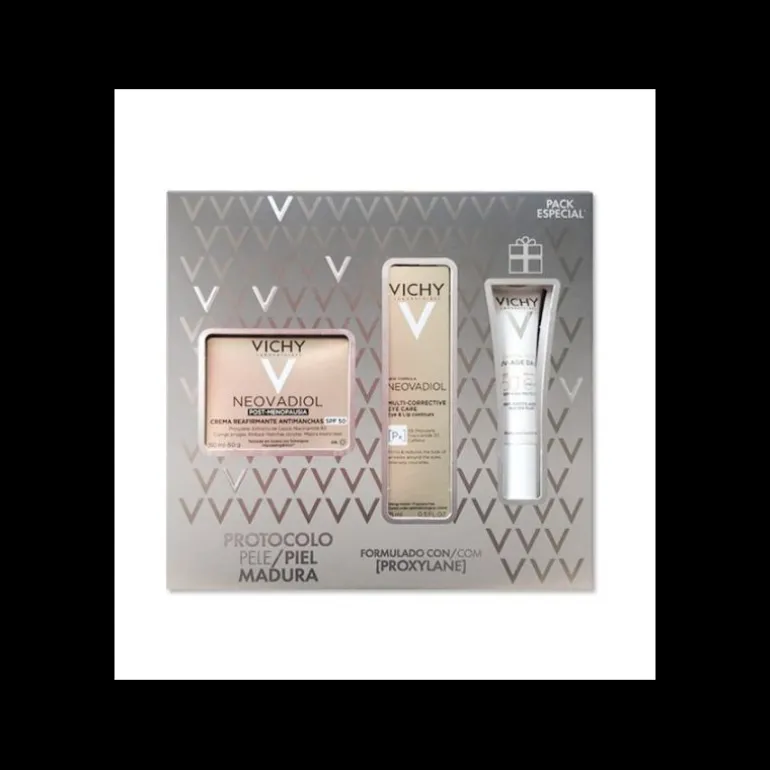 Vichy Pack Neovadiol Post Menopausia está especialmente formulado para pieles maduras que necesitan un cuidado intensivo tras la menopausia. La Crema Post Menopausia SPF50 50ml ayuda a redensificar, rellenar y proteger la piel gracias a su fórmula con ácido hialurónico, activos nutrientes y una alta protección solar que previene el fotoenvejecimiento. El Contorno de Ojos 15ml nutre y alisa la delicada zona ocular, reduciendo arrugas y signos de fatiga. Además, la Mini Talla UV Age Daily ofrece protección diaria frente a rayos UVA, UVB y luz visible, ayudando a mantener la piel joven y saludable. Todos los productos contienen agua termal mineralizante de Vichy y están testados dermatológicamente para piel sensible.