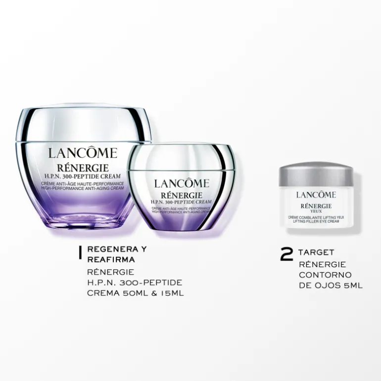Incluye la crema Rénergie H.P.N. 300-Peptide 50 ml, enriquecida con una avanzada tecnología que combina 300 tipos de Péptidos, Ácido hialurónico y Niacinamida para actuar sobre arrugas, firmeza y textura de la piel.