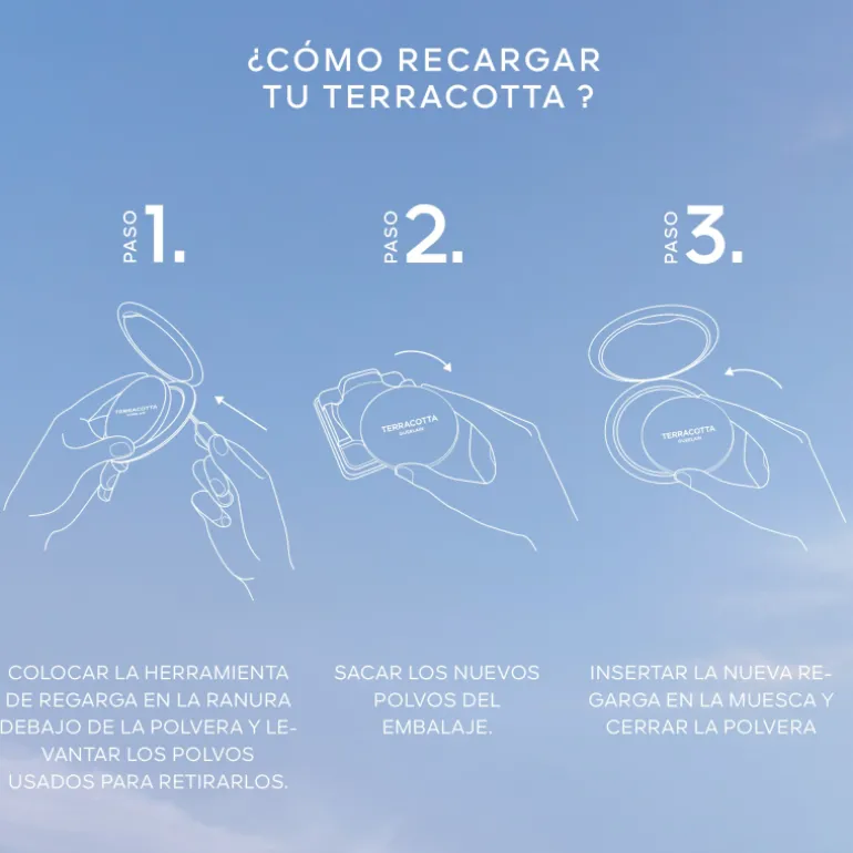 El perfume de los polvos Terracotta invita a la evasión. Las notas de ylang ylang y flor de naranjo envuelven en una agradable sensación.