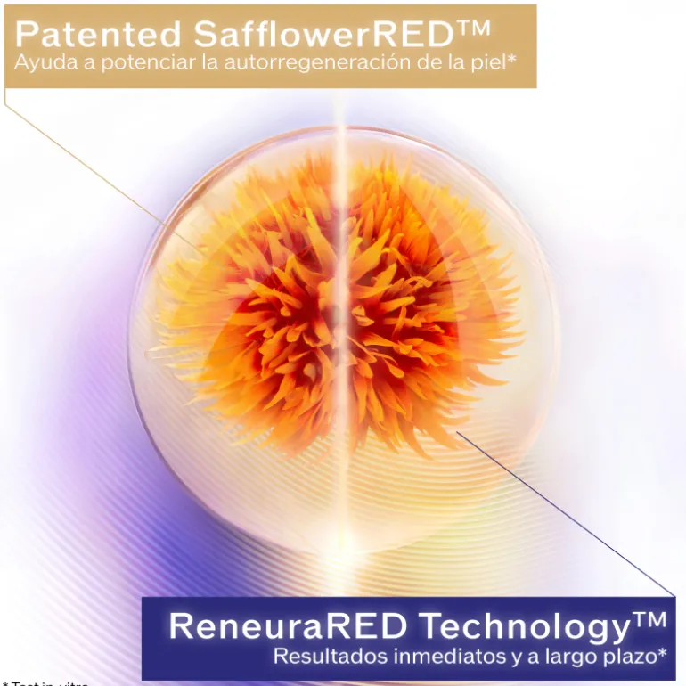 Potenciados por el nuevo SafflowerREDTM patentado: este potente ingrediente ayuda a potenciar la red de nutrientes invisibles de la piel y la autoregeneración* para combatir la aparición de arrugas profundas, la flacidez cutánea y el tono desigual de la piel.