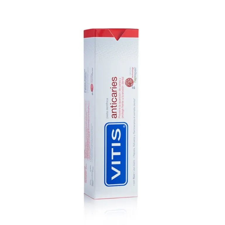 VITIS® anticaries es la única pasta dentífrica con 3 mecanismos de acción específicos para la prevención de la caries y protección frente a la erosión dental.Gracias a su fórmula triple acción anticaries con hidroxiapatita activa, flúor y xylitol; repara, refuerza y remineraliza el esmalte para una prevención superior de la caries dental.