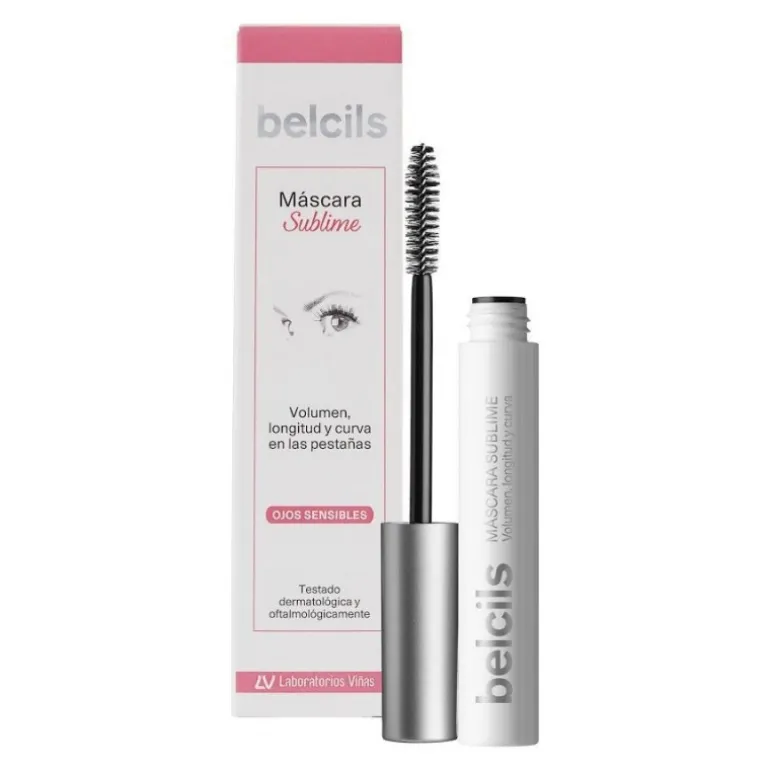 Máscara Sublime Belcils. Curva, da volumen, fortalece y regenera las pestañas. Consigue este efecto gracias a su fórmula y cepillo. Contiene una combinación exclusiva de ceras naturales que proporcionan una textura consistente que se adhiere y envuelve a las pestañas, aportando longitud ,volumen y curvatura de larga duración. Su cepillo cónico con fibras de doble tamaño facilita la aplicación del producto sin dejar grumos en la pestaña. Especialmente indicada para ojos sensibles.