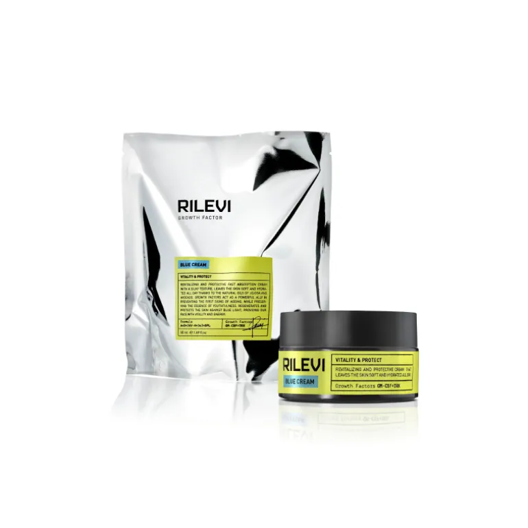 Rilevi Blue Cream. Crema revitalizante y protectora de textura sedosa y rápida absorción, deja la piel suave e hidratada todo el día gracias a los aceites naturales de jojoba y aguacate.