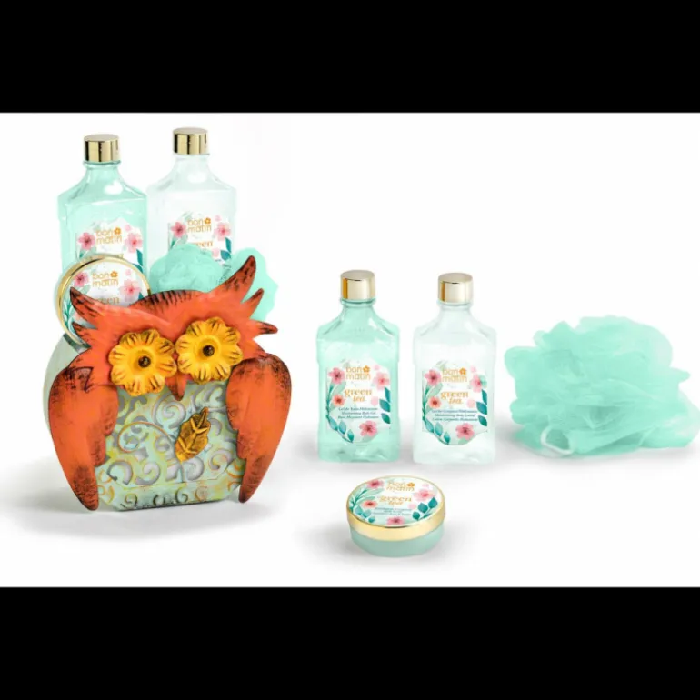 Buho metálico con un Gel + Crema corporal + Esponja de baño + Exfoliante corporal.