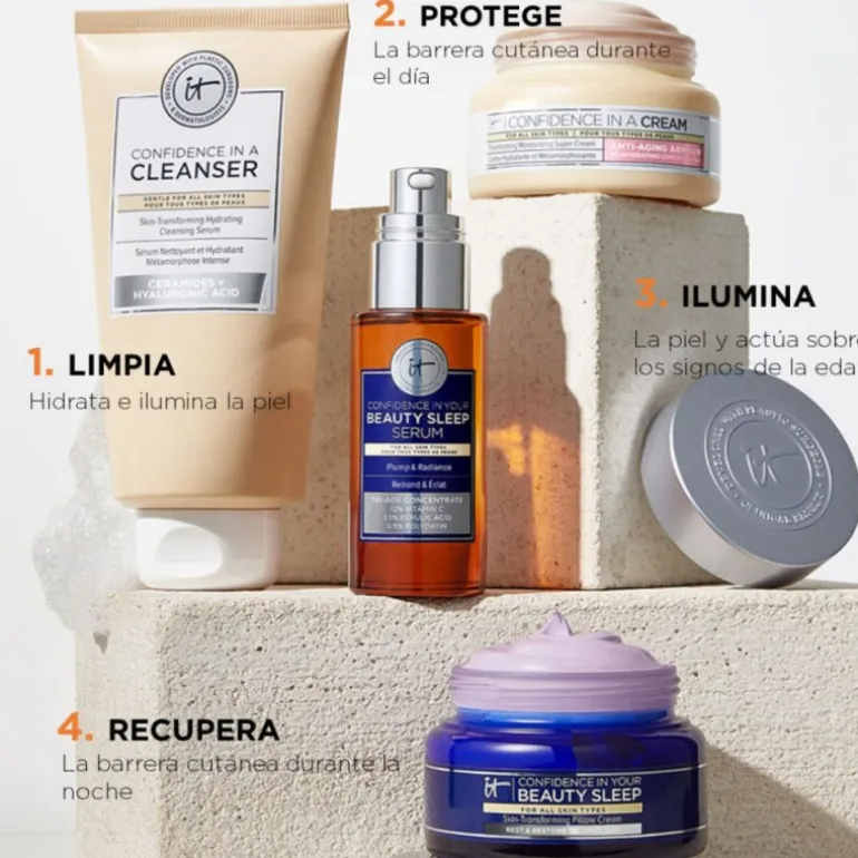 Descubre Confidence in your Beauty Sleep Serum de IT Cosmetics, el sérum antiedad e iluminador capaz de actuar sobre los signos de la edad y regenerar la barrera cutánea durante la noche gracias a 3 antioxidantes clave: 12% de Vitamina C, 1,5% de Ácido Ferúlico y 0,5% de Polidatina.»