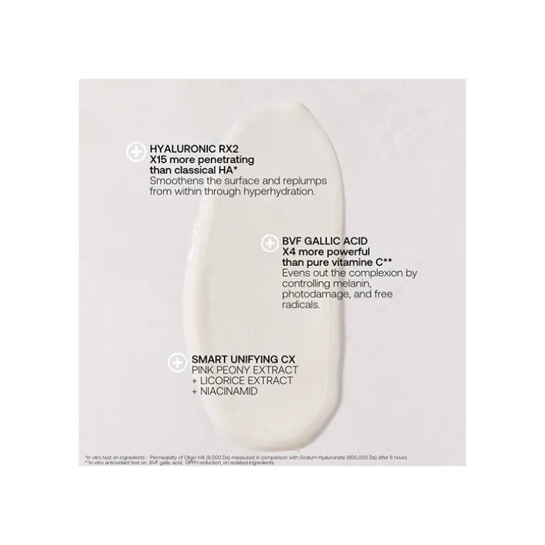 Ácido hialurónico RX2: 15 veces más penetrante que un ácido hialurónico clásico*. Alisa la superficie y rellena en profundidad mediante una superhidratación.