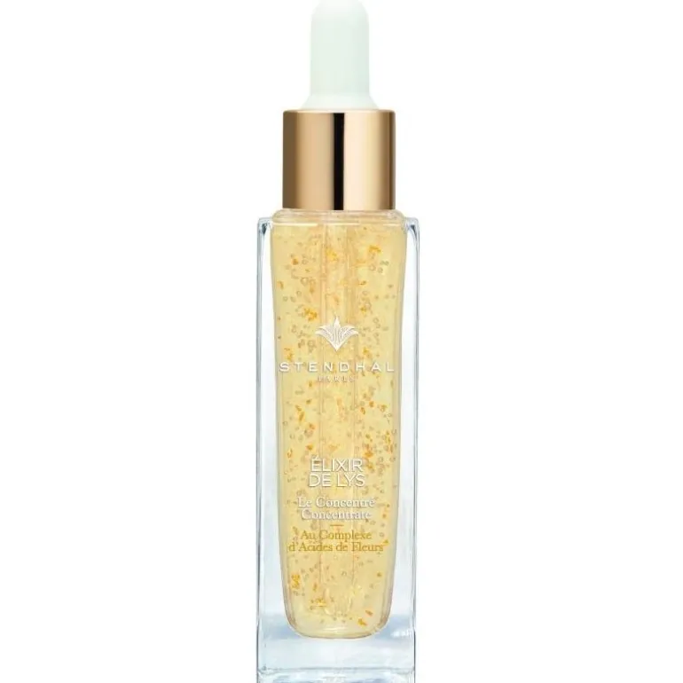 El Élixir de Lys邃éctar de luz, se combina con un complejo regenerador de ácidos florales y de pétalos de oro de 24 quilates para unificar e iluminar la piel, así como difuminar las manchas y las imperfecciones.