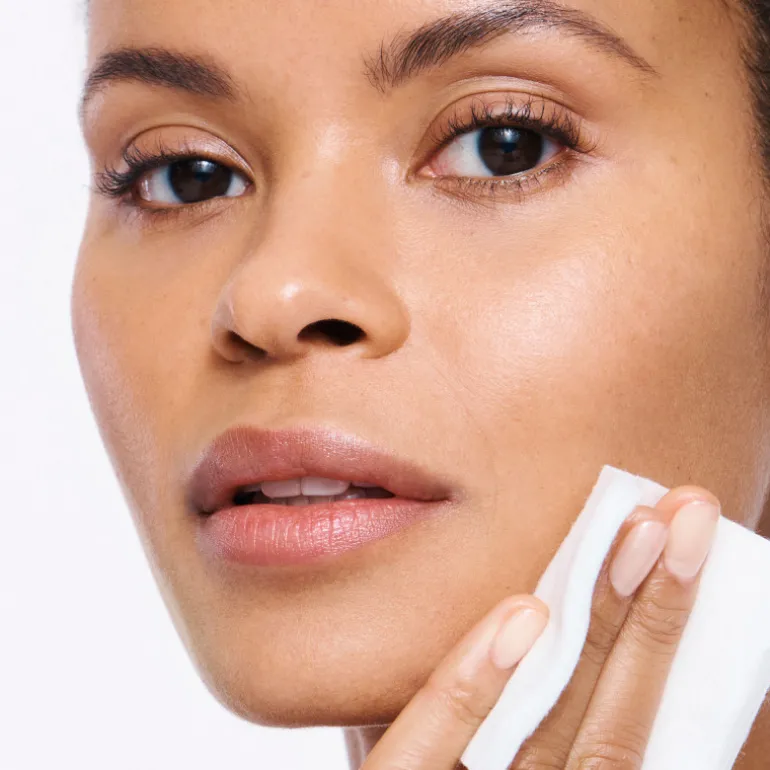 Después de la aplicación de loción o emulsión, alise suavemente la almohadilla de algodón sobre la cara.
