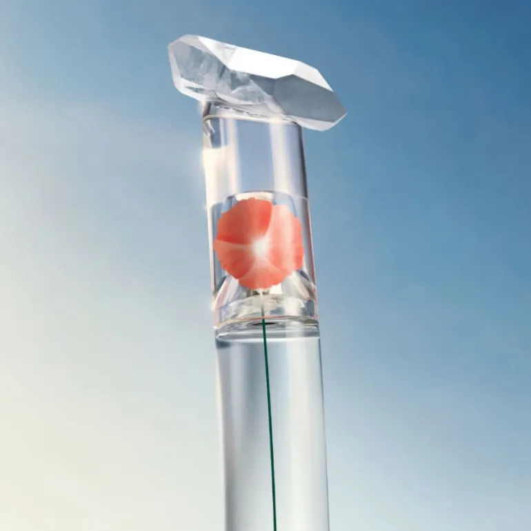 Alojado en un ramo de frascos de vidrio que alcanzan el cielo, FLOWER BY KENZO Eau de Toilette revela una amapola en tonos pastel y sombras tocadas por la luz.