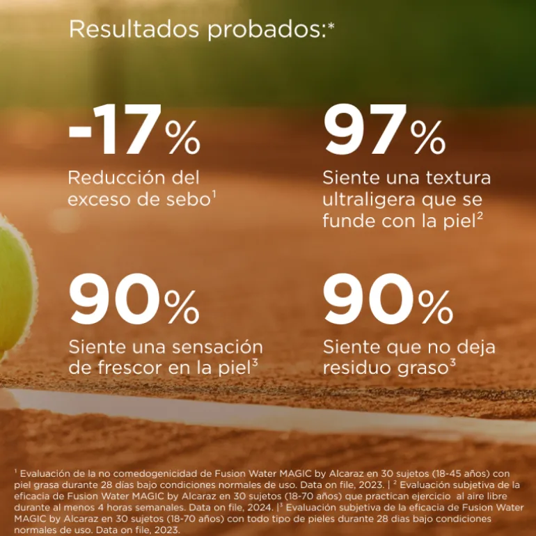 Saca tu mejor versión con el fotoprotector facial ultraligero de uso diario Fusion Water MAGIC by Alcaraz SPF 50. Aporta efecto refrescante y, gracias al Heat Stress Protect, protege la piel frente a los radicales libres generados por el calor derivado de la práctica deportiva.