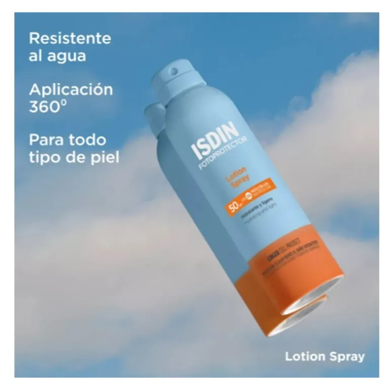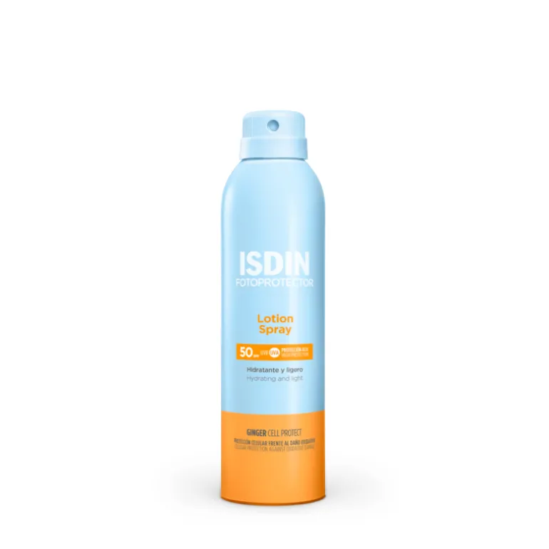 Isdin Fotoprotector Loción Spray SPF50 es un protector solar corporal en loción ligero, hidratante y de absorción inmediata.