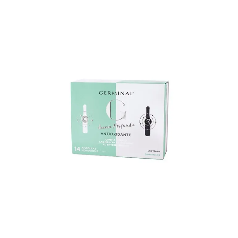 ACCIÓN PROFUNDA ANTIOXIDANTE NOCHE Y DIA 14 AMPOLLAS, combate los radicales libres y mejora el aspecto de la piel gracias a la combinación de diferentes principios activos. El nuevo Germinal Acción Profunda Antioxidante con Redotioxil® ilumina, reduce las manchas y previene el envejecimiento cutáneo.