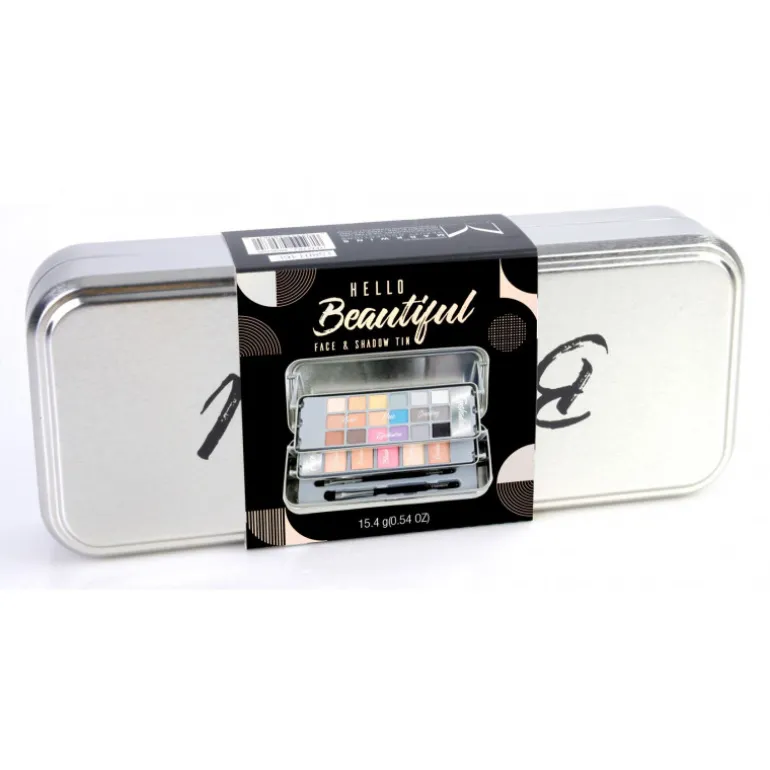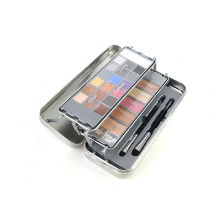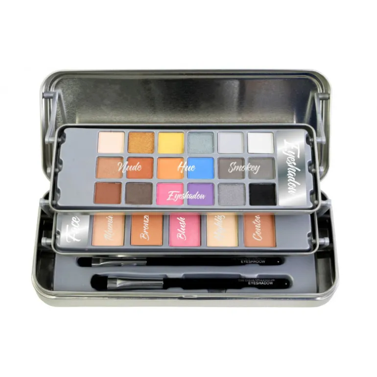 Una Lata que incluye: 24 tonos sombras de ojos, 3 tonos para Cejas, Polvos para el contorno, Iluminadores, Bronceador, Colorete, 3 pinceles de maquillaje.