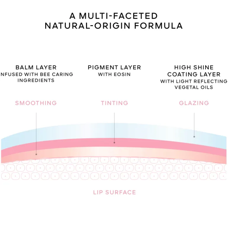 La fórmula hidratante y redensificante de KissKiss Bee Glow Oil combina tres ingredientes de origen natural procedentes de la colmena para sublimar los labios: