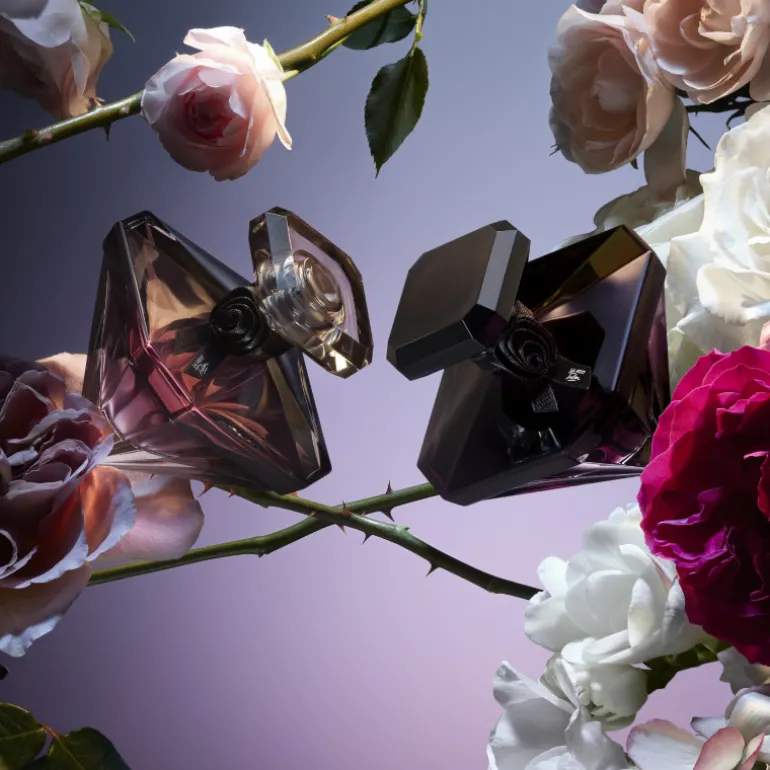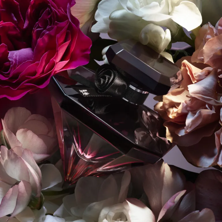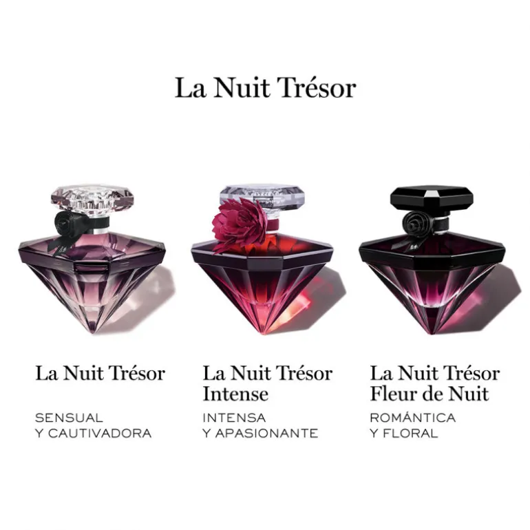 Las hipnotizantes notas florales de La Nuit Trésor Fleur de Nuit se encapsulan en nuestro icónico frasco diamante, revestido de un irresistible halo nocturno, el más oscuro jamás fabricado.