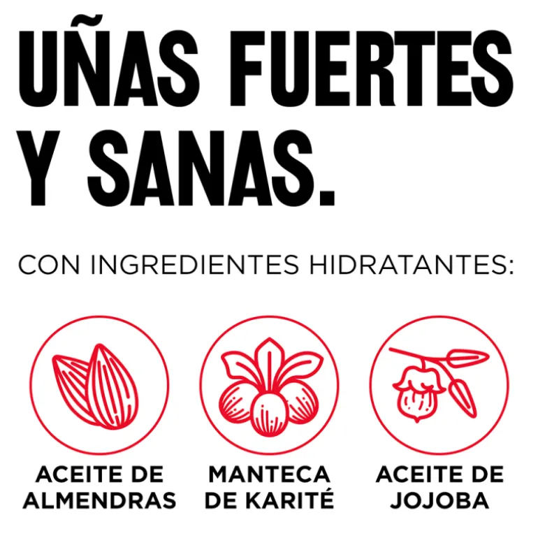 Gracias a su fórmula con ingredientes acondicionadores (aceite de almendras, aceite de jojoba, y manteca de karité) protege y fortalece las uñas manteniéndolas hidratadas.