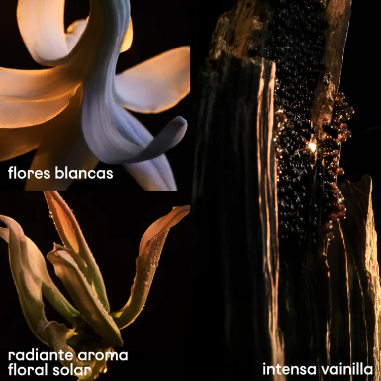 Notas de Corazón: Deslumbrante nardo, jazmín y un radiante ylang ylang.