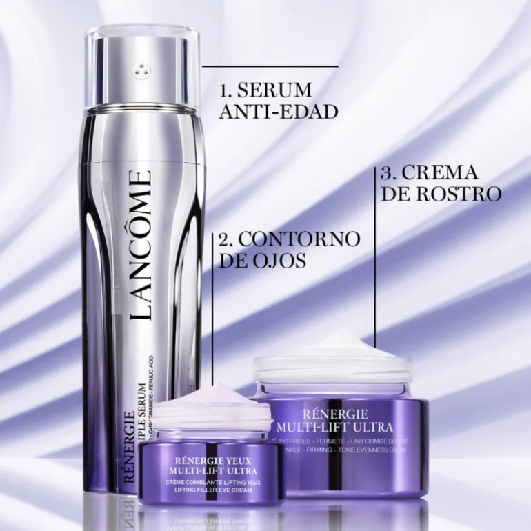 4. Para potenciar los resultados de tu rutina anti-edad con un extra de nutrición e hidratación a la vez que potenciando la fotoprotección en tu rostro, te recomendamos utilizar la crema de rostro Rénergie Multi-Lift Ultra y el contorno de ojos Rénergie Yeux Multi- Lift Ultra.