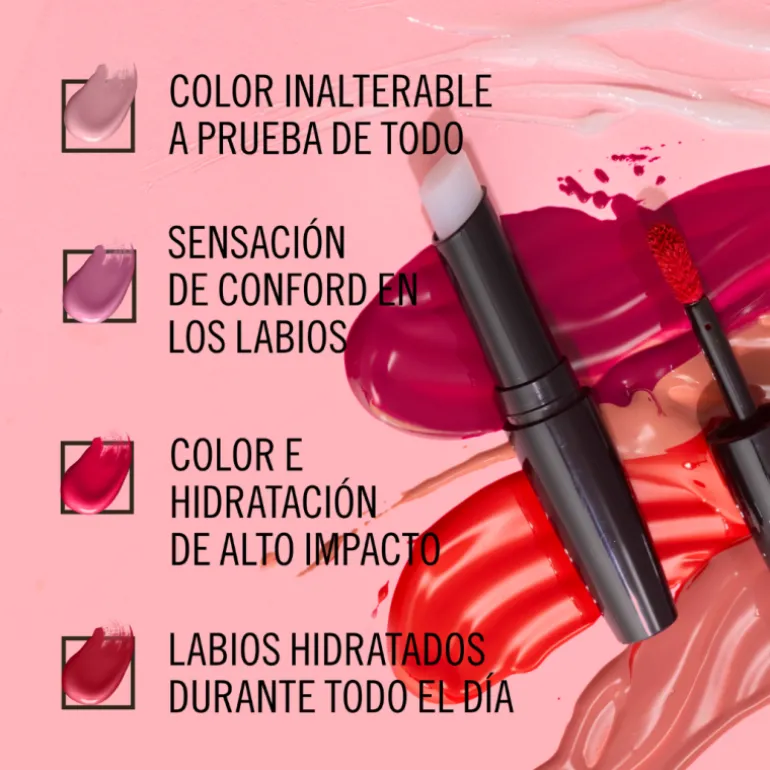 Hasta 16 horas de color inalterable. Color e hidratación de alto impacto. Brillo e hidratación para una sensación de confort en los labios. A prueba de roces, besos, cenas窶¡no mancha ni transfiere!.