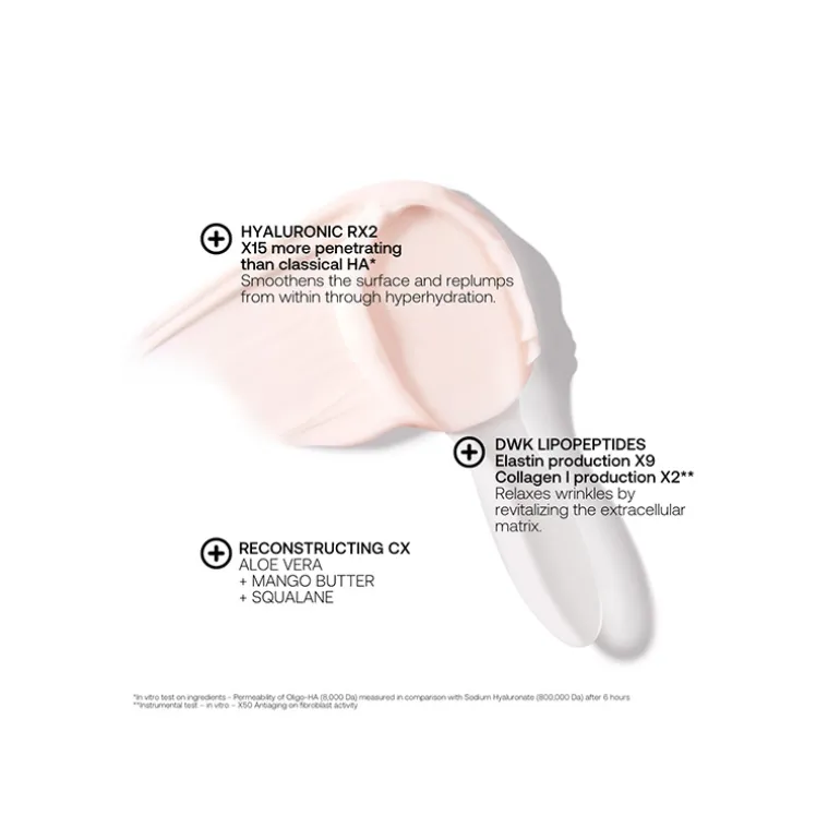 Ácido hialurónico RX2: 15 veces más penetrante que un ácido hialurónico clásico*. Alisa la superficie y rellena en profundidad mediante una superhidratación.