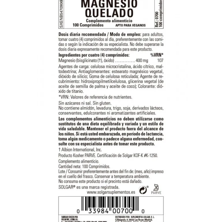Solgar® Magnesio Quelado aporta 100 mg de magnesio en cada comprimido.