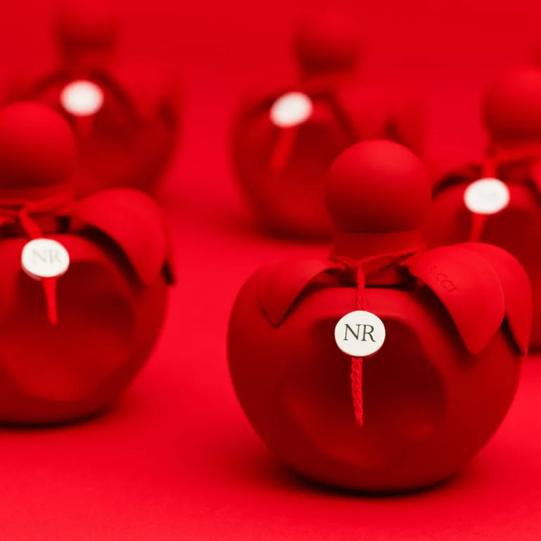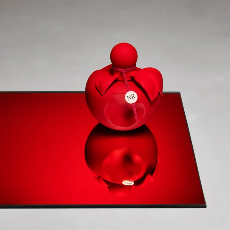 Esta vez, el icónico frasco en forma de manzana se viste por completo de un rojo intenso con un acabado mate y aterciopelado.