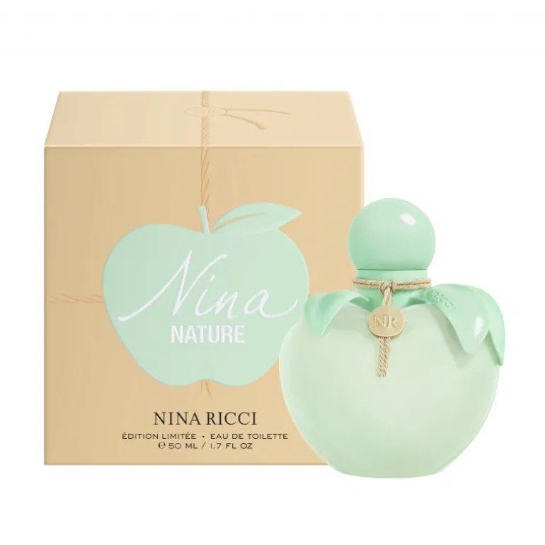 Nina Nature refleja su filosofía natural en su envase. Para esta edición limitada, el icónico frasco de Nina Ricci con forma de manzana se reinventa en un verde total.