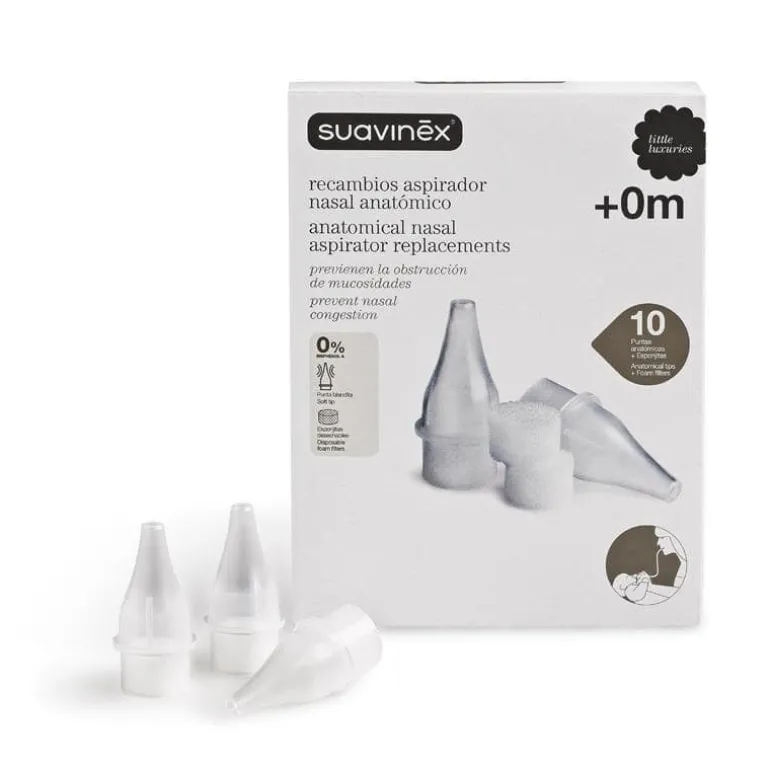 Recambio de aspirador nasal anatómico para aliviar las molestias y dificultades que pueda sufrir el bebé a causa de la congestión nasal. Sobre todo, pensando en niños pequeños que aún no saben sonarse la nariz. Extrae la mucosidad aspirando, sin alterar la presión en los oídos y sin molestias.