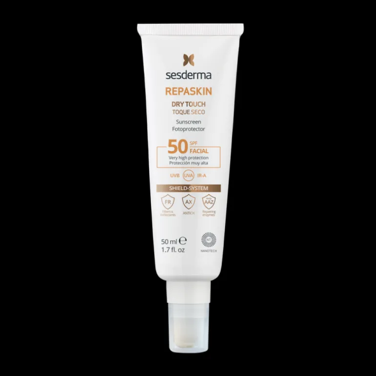 A continuación, aplica generosamente en el rostro el protector solar de Repaskin Toque Seco 30 minutos antes de exponerte al sol, realizando un ligero masaje.