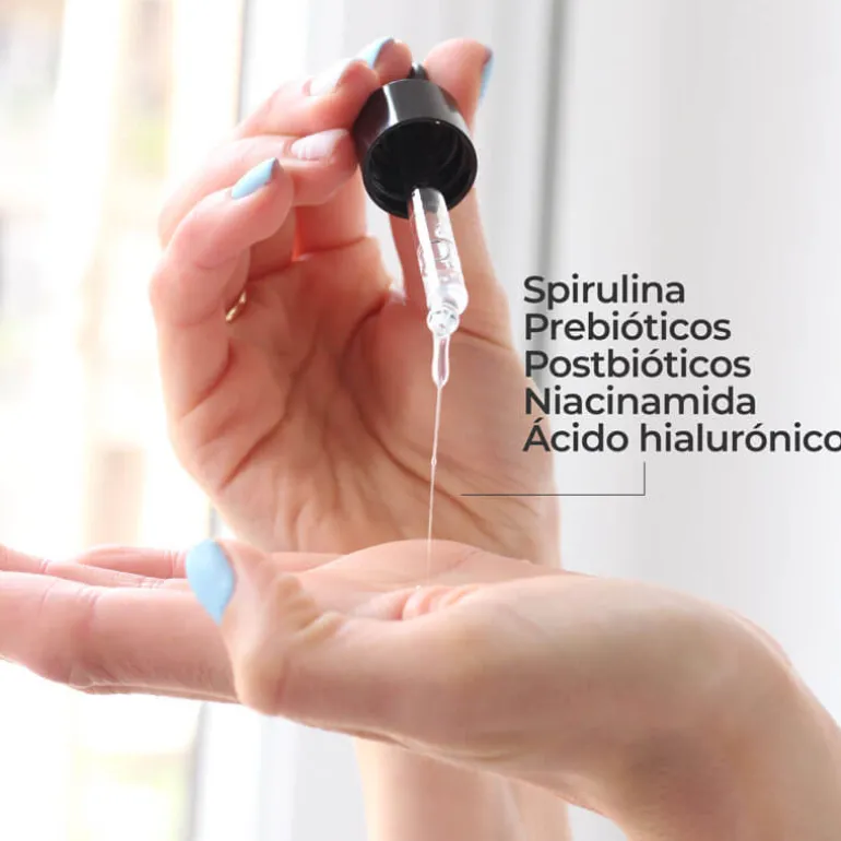 La piel se vuelve más resistente, equilibrada y libre de imperfecciones gracias a la combinación de ácido hialurónico, niacinamida, prebióticos y post-bióticos.