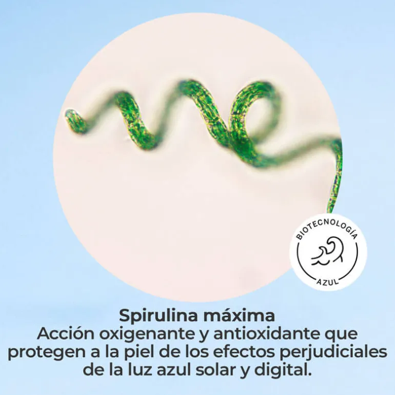 Protege del daño de la luz azul de las pantallas (HEV), previniendo el envejecimiento prematuro, la deshidratación, y mejorando la regeneración natural de la piel.