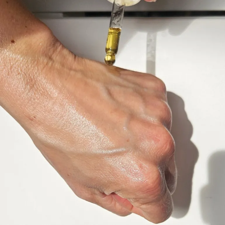 Depositar unas gotas de sérum sobre la palma de la mano y calentar frotándolas para activar los aceites.