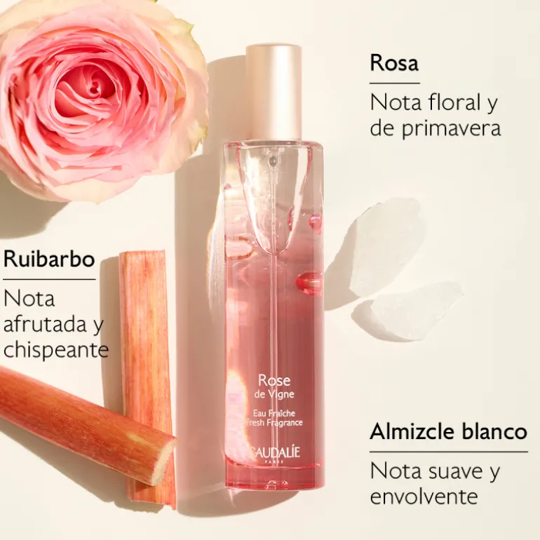 Su estela evoca las notas florales y el frescor vegetal de la rosa de la vid a primera hora de la mañana, cuya fragancia se mezcla con las notas ácidas del ruibarbo.