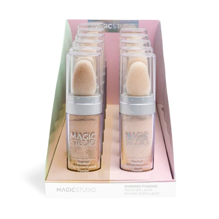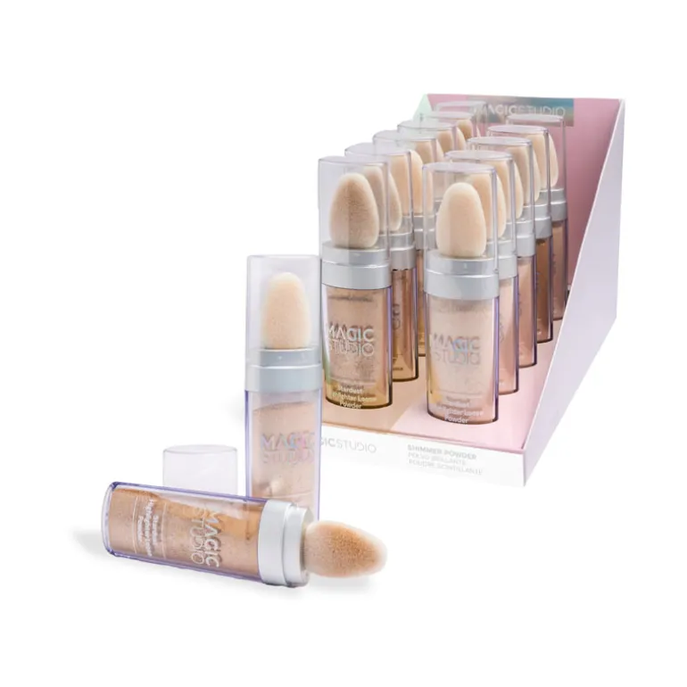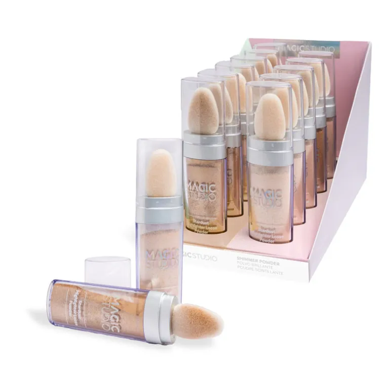 Descubre el deslumbrante brillo de Magic Studio Shimmer Powder, disponible en dos cautivadores tonos: champagne rosado y cobre dorado.