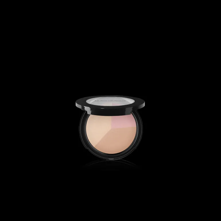 Con ayuda de una brocha suave, mezclar el trío de polvos con movimientos circulares. Aplicar los polvos en la zona media del rostro, en la frente, nariz y barbilla.