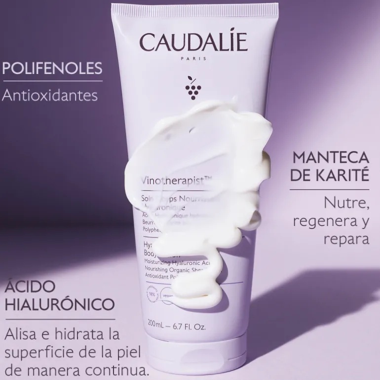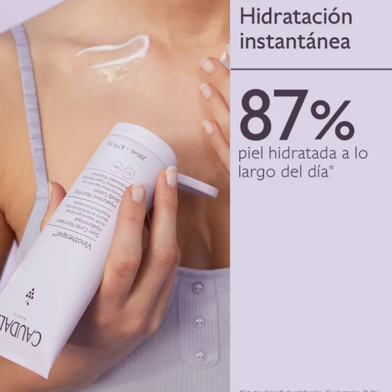 El Tratamiento Corporal Nutritivo Hialurónico hidrata y nutre instantáneamente dejando la piel suave, flexible y luminosa durante todo el día, como después del Spa Vinothérapie邃